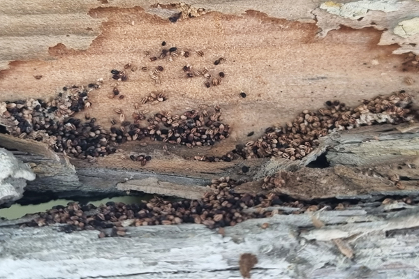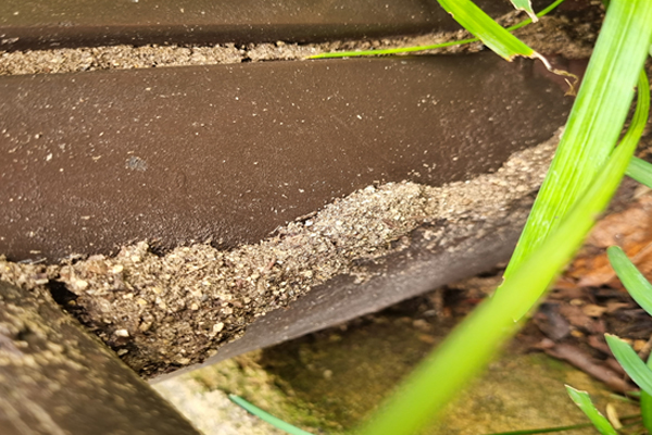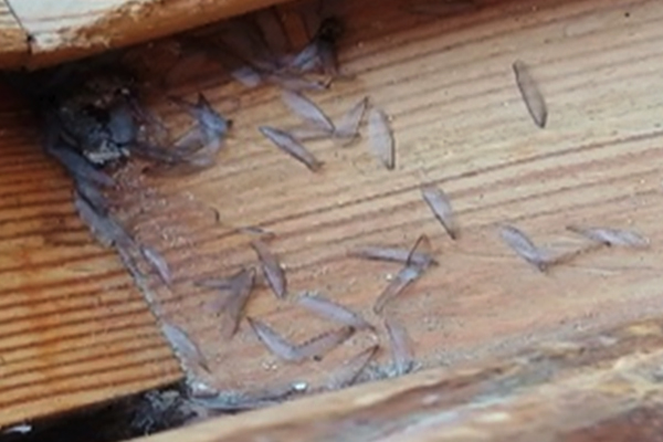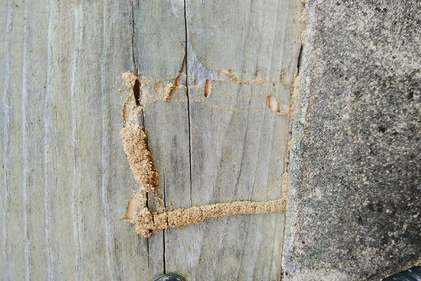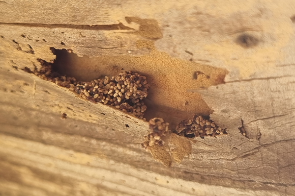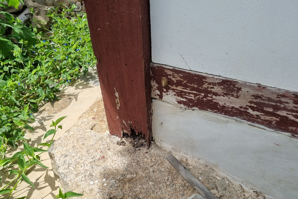 목조 건축물에서 작은 알갱이의 흰개미 배설물을 발견하면 흰개미 군체를 있음을 확인할 수 있습니다.